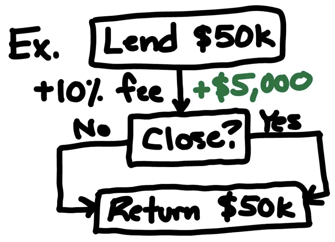 We charge a flat 10% up-front return on all EMD deals and only fund up to $100k EMD. Deals over 30 days will have an additional fee. The 10% fee is non-refundable , and has a minimum of $1,500.